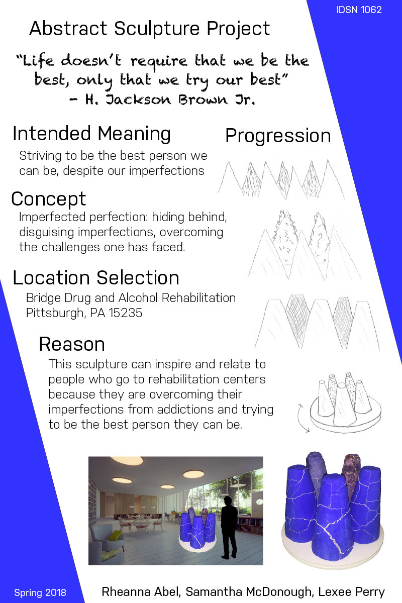This group project began by researching famous 3D abstract art/sculptures around the world to understand their intended meanings of their form and context. This research led into creating our own 3D sculpture that expresses the message of a quotation given to us in class. We were asked to pick a location where our sculpture would be able to connect and reflect its surroundings the best.