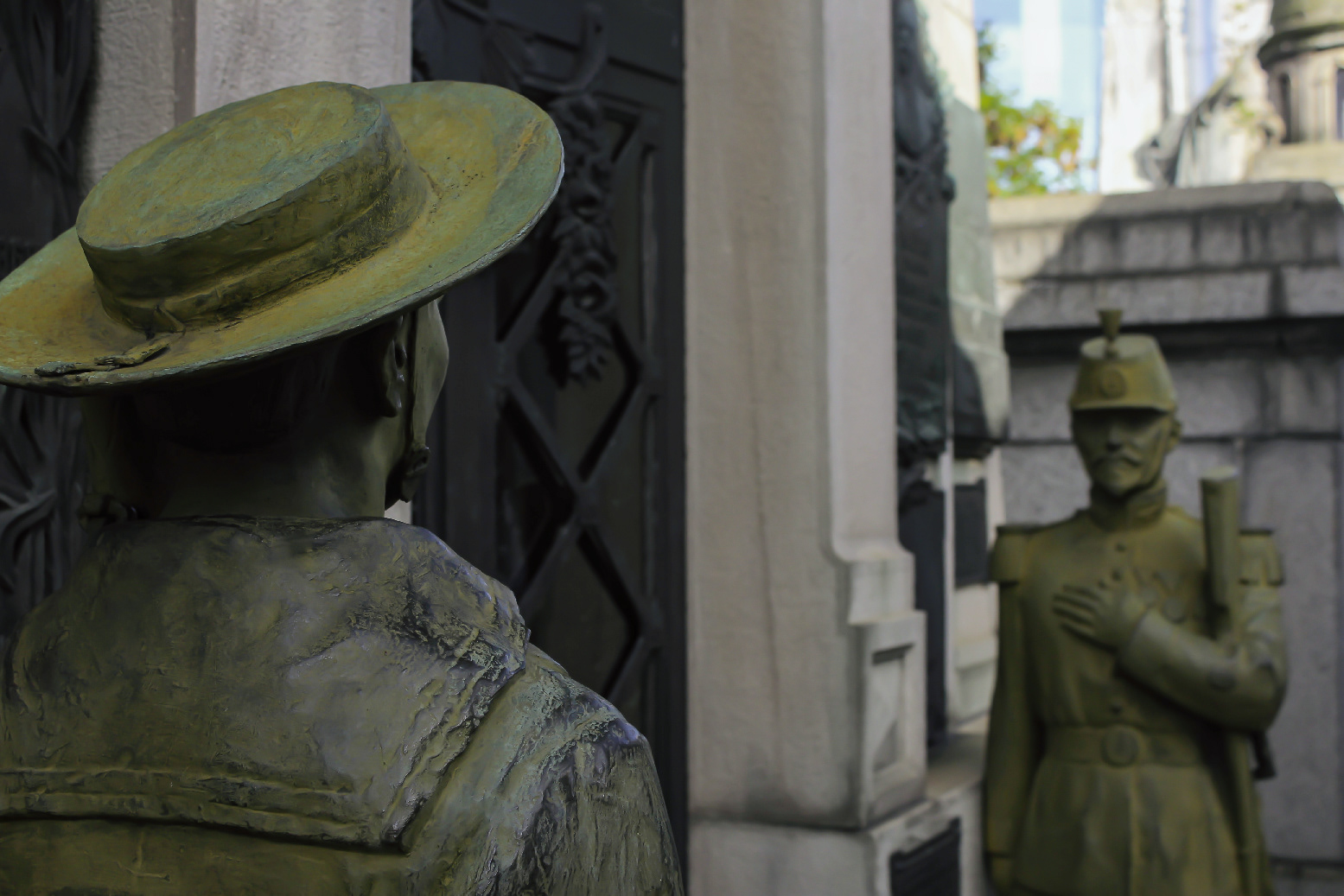Statues of soldiers face each other in front of a mausoleum for a military general at La Recoleta Cemetery. The cemetery contains many elaborate marble mausoleums, decorated with statues, in a wide variety of architectural styles such as Art Deco, Art Nouveau, Baroque, and Neo-Gothic. With over 4,600 graves that spans 14 acres, it is the burial site of Argentina’s most famous figures such as journalists, presidents, soldiers, and more. ― Buenos Aires, Argentina. March 15, 2019.