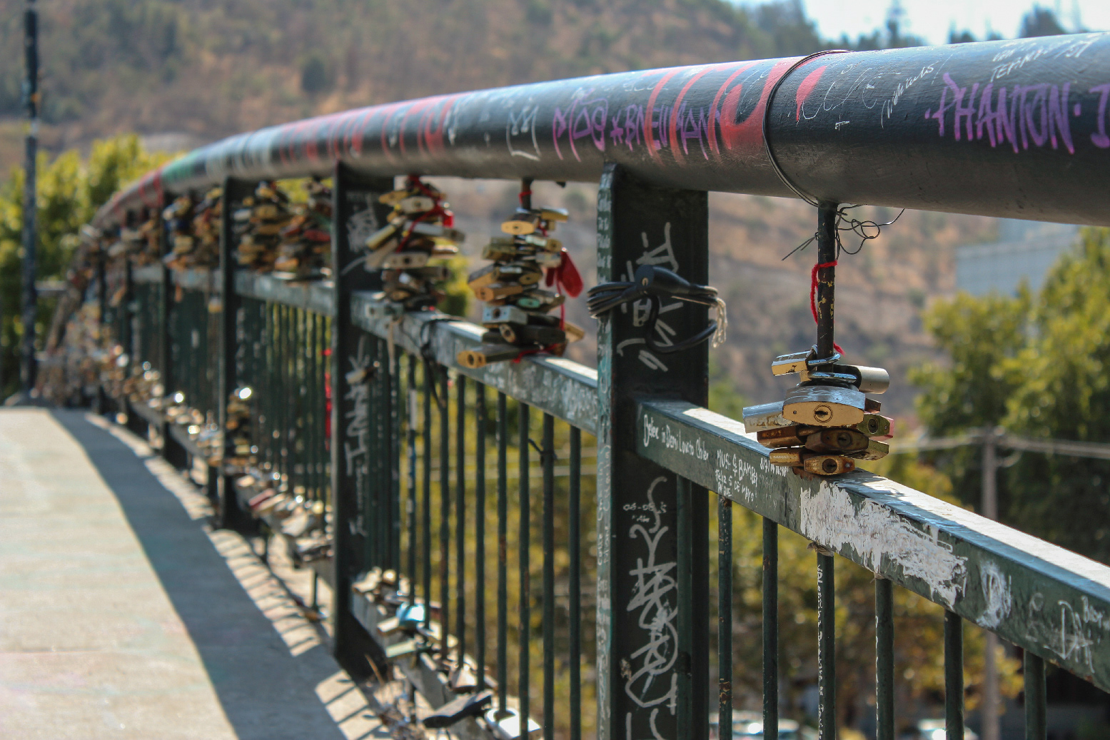 A collection of locks link to a walking bridge that overlooks the Mapocho River in Santiago while graffiti colors the hand railing. What I find unique about these locks is that none are the same and the symbolization behind them varies between each person that locked it on the bridge. ― Santiago, Chile. March 9, 2019.