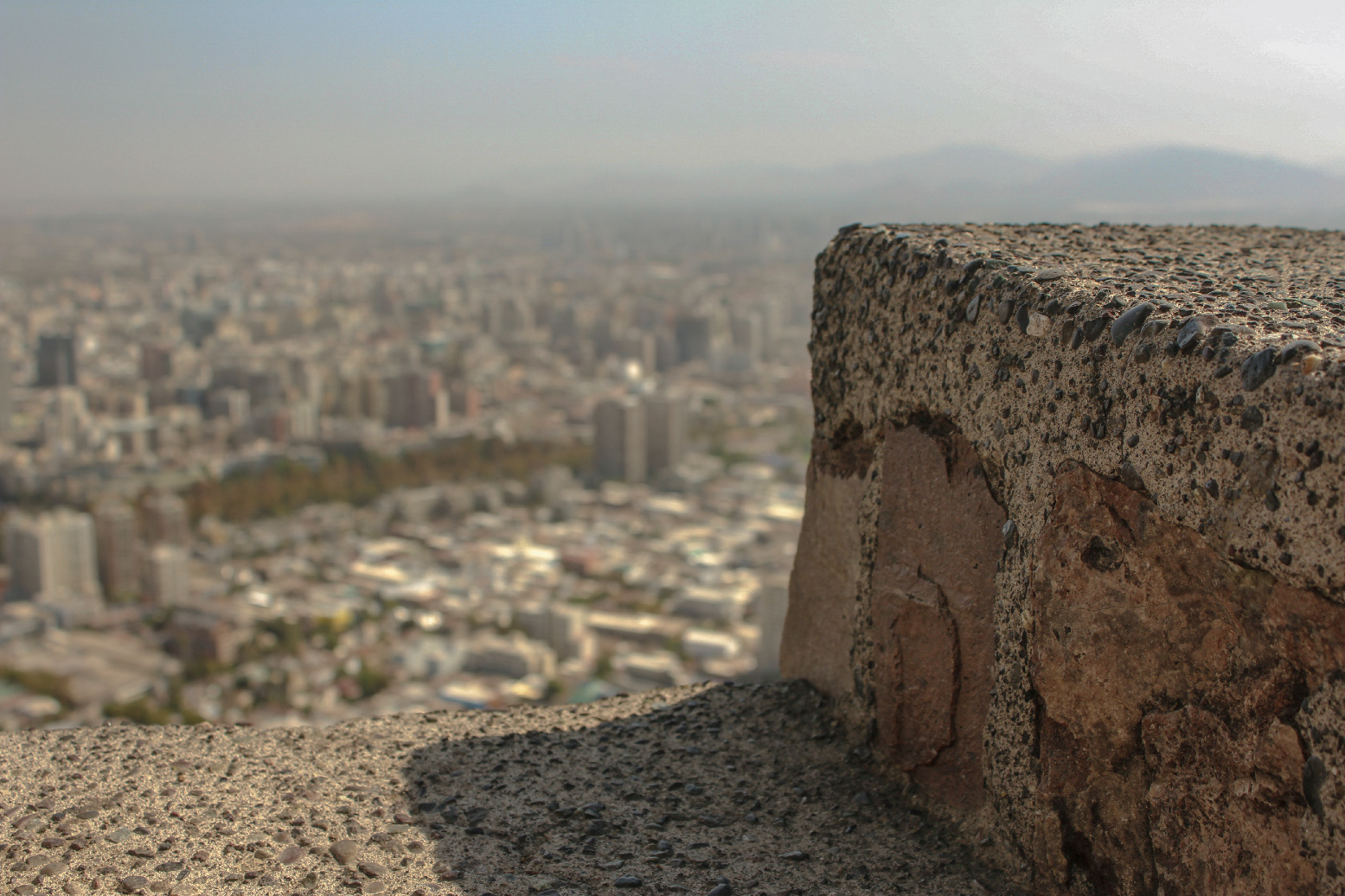 A cement wall surrounds the lookout on San Cristobal Hill overlooking the vast city of Santiago, Chile. Mountains enclose the city in the distance and thousands of buildings fill in the empty space. After riding the Funicular of Santiago to the top, the view when we walked to this very spot was breathtaking, I wanted to capture it in a way that would show how large the city was from a distance. ― Santiago, Chile. March 9, 2019.