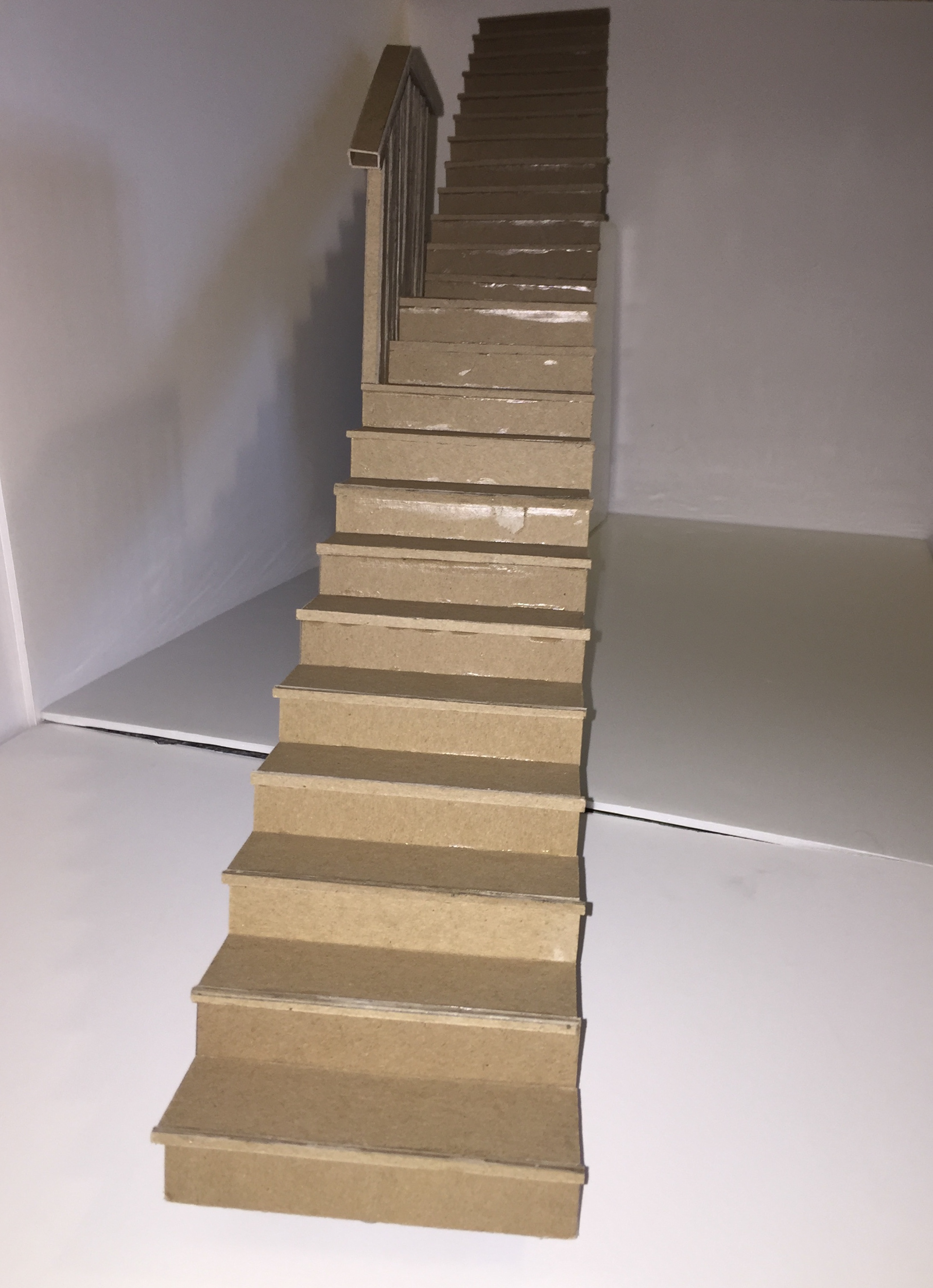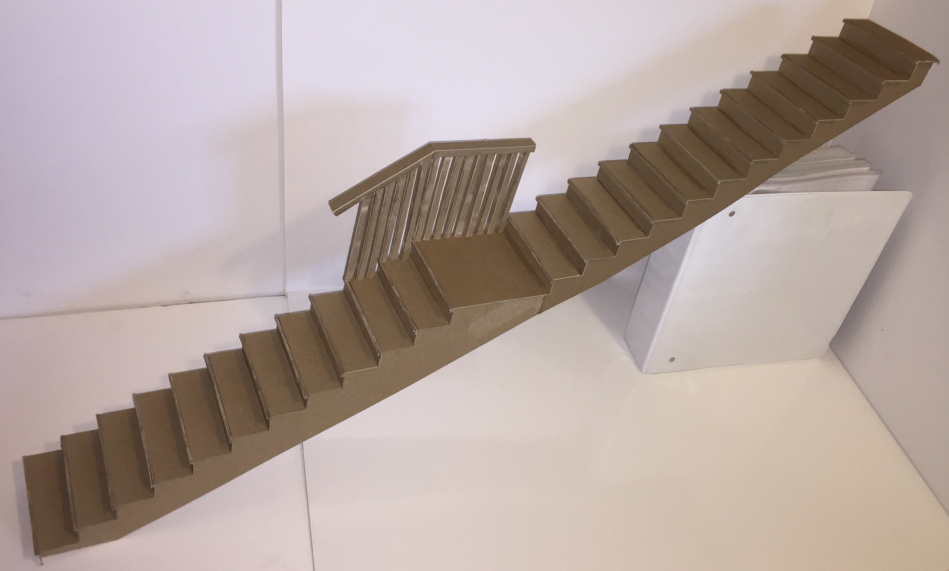 Understand all the parts needed for a correct staircase; such as the tread, riser, nosing, stringer, landing, balustrade, and hand railing. A 3D model made of chipboard was constructed to correctly calculate the number of risers and treads needed on a straight run staircase design.