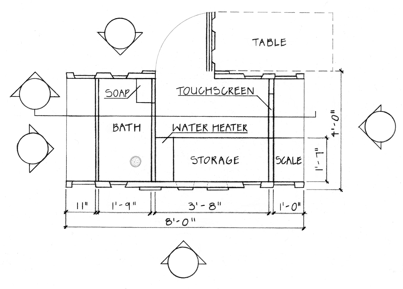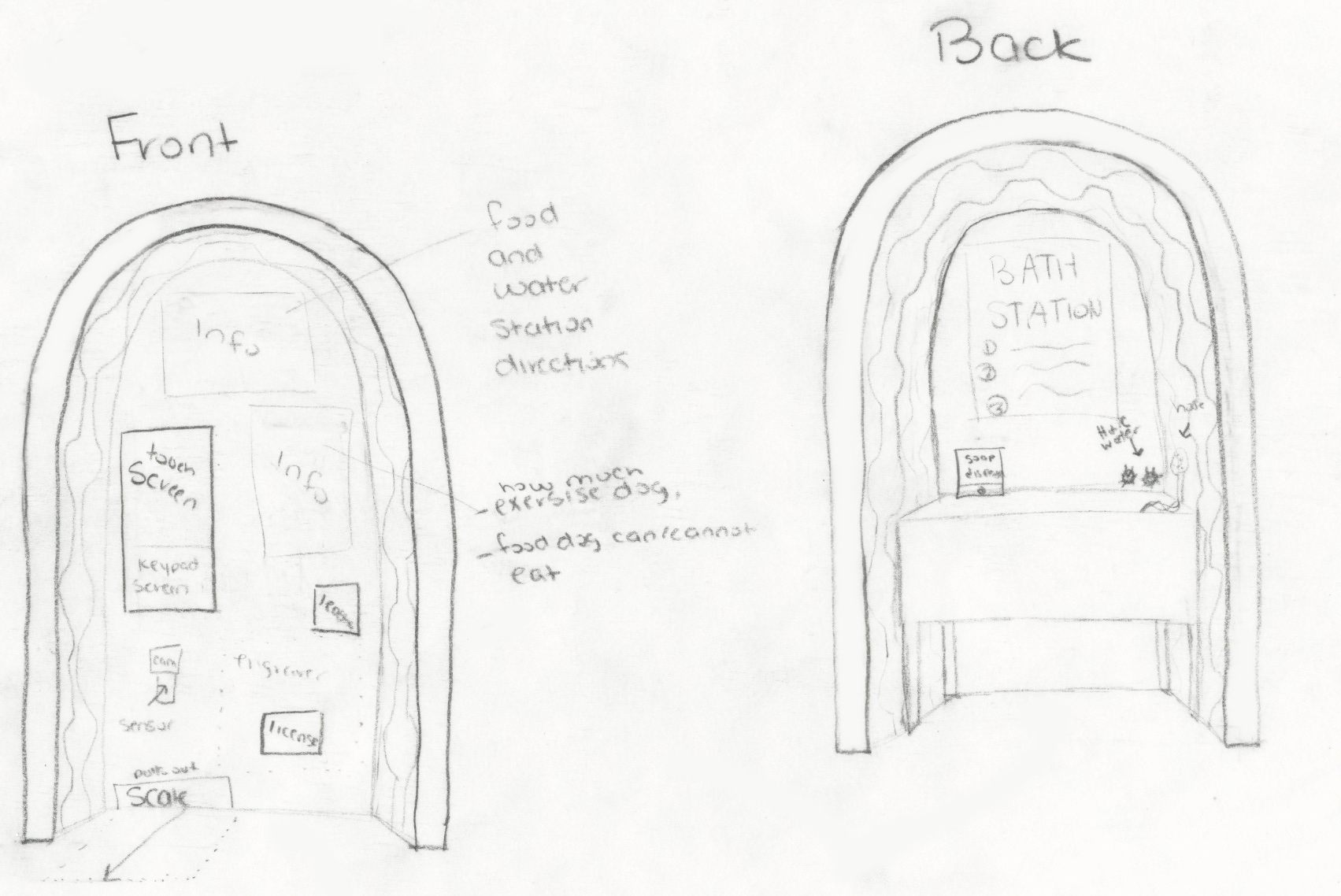 My final design consists of a kiosk screen, bath station, food and water station, and a door to access storage. This kiosk will relieve the stress and anxiety of the homeless who cannot provide for their dog by providing them necessary resources.