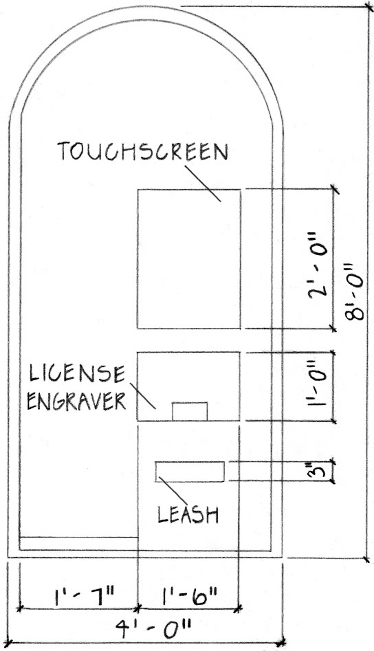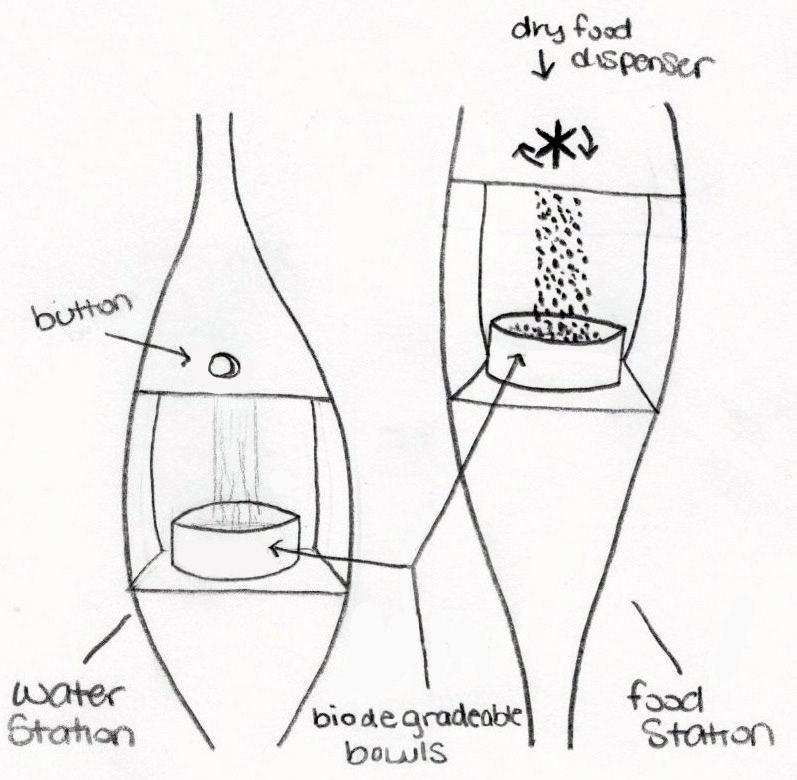 The pattern design functions as a food and water access. The food amount supplied daily is measured according to the dog’s weight and the water is unlimited. The kiosk system works by creating an account for each dog with a personal 4 digit code engraved on the back of the dog’s license. A drop-down table allows vets to hold checkups a few hours a day.