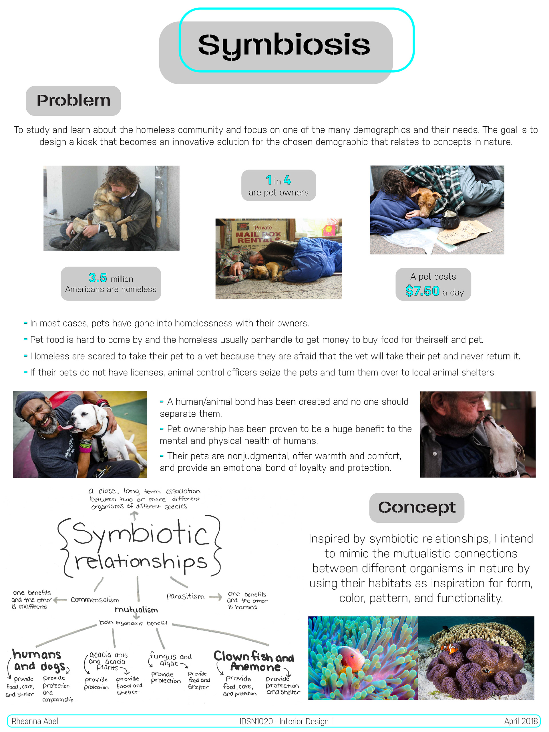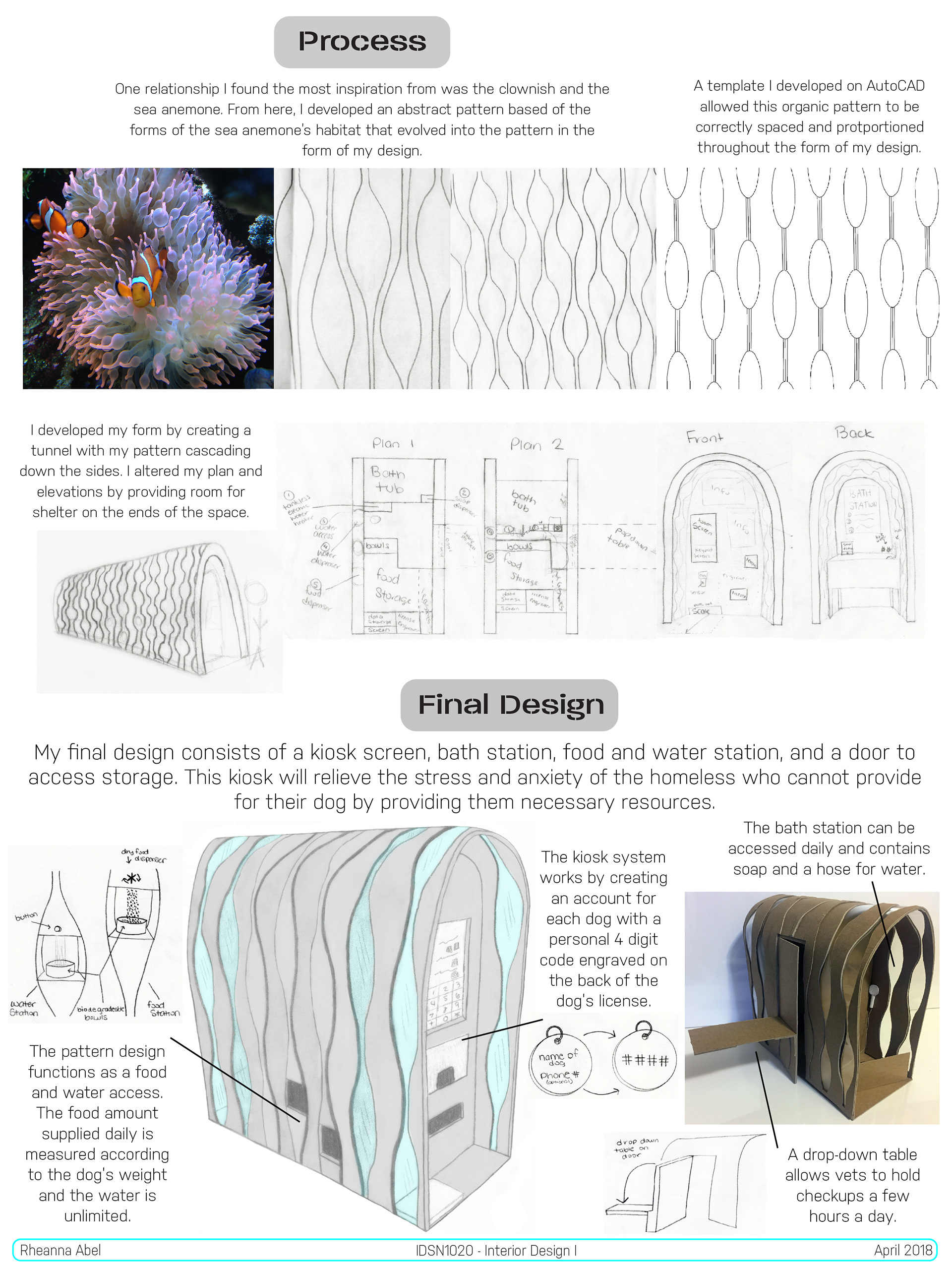 The purpose of this project was to study and learn about the homeless community and focus on one of the many demographics and their needs. My chosen demographic was homeless people with dogs. The goal is to design a kiosk that becomes an innovative solution for this chosen demographic that relates to concepts in nature.