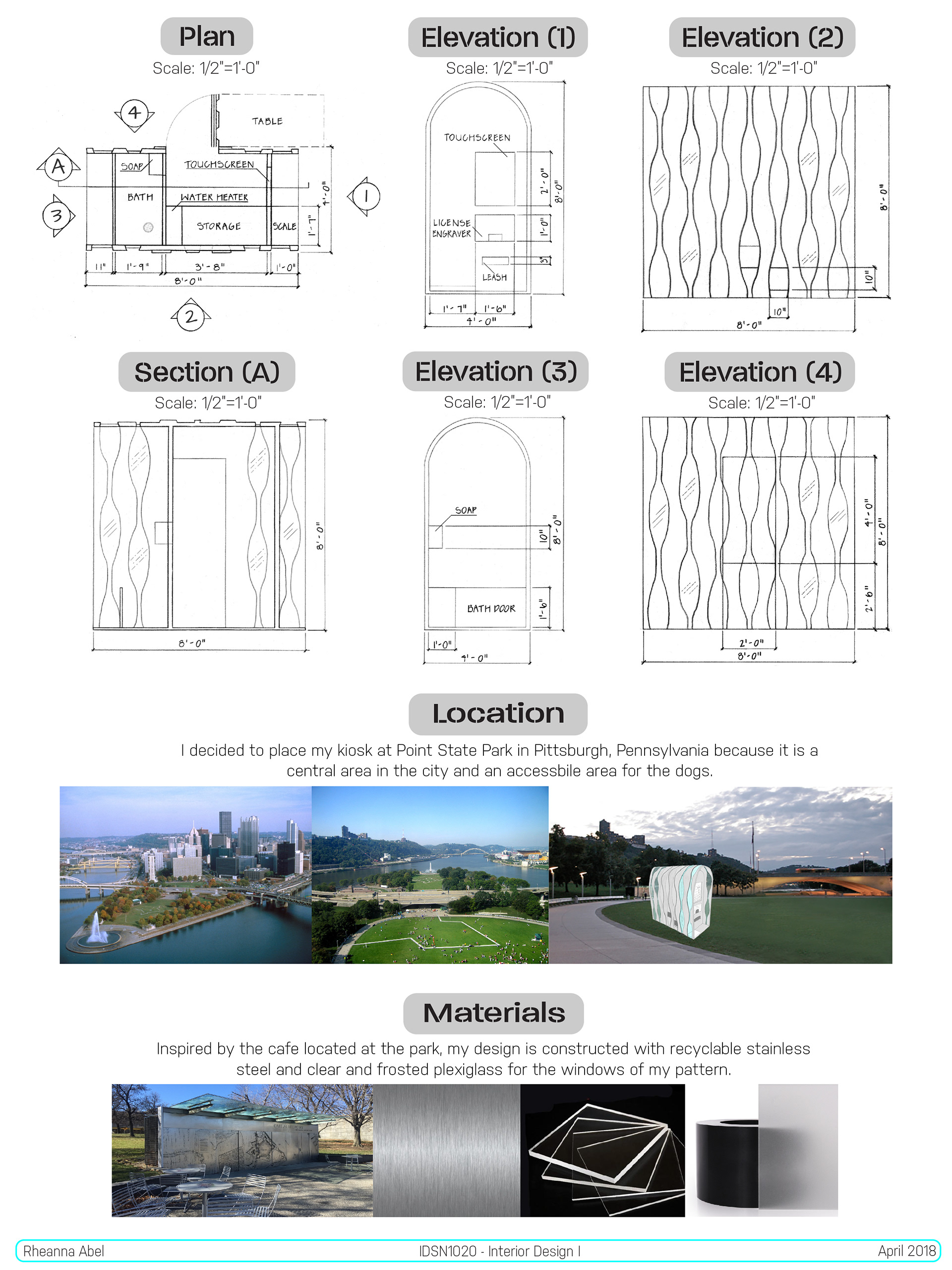Inspired by the cafe located at the park, my design is constructed with recyclable stainless steel and clear and frosted plexiglass for the windows of my pattern.